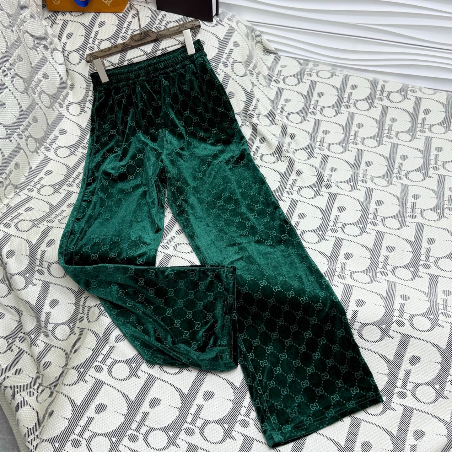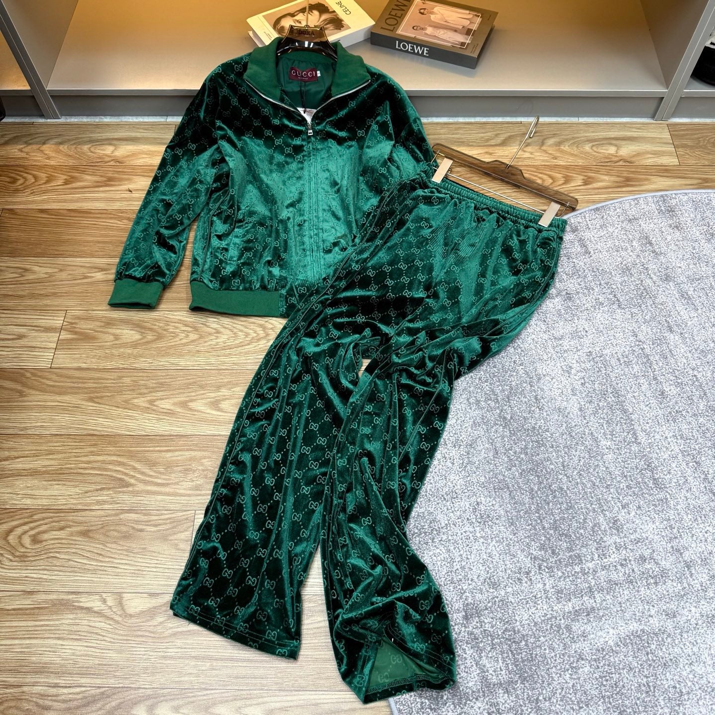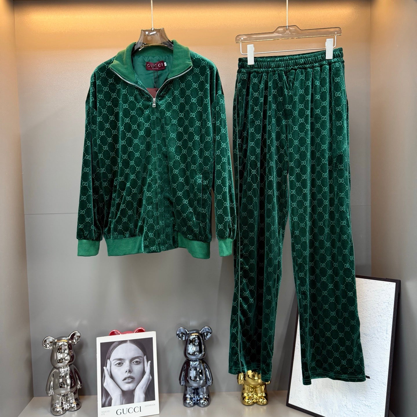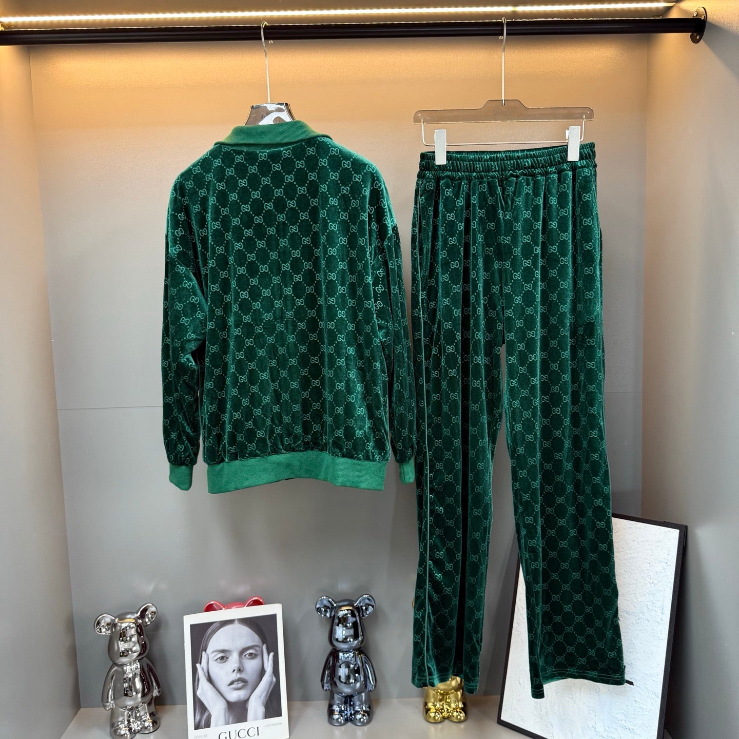 GUCCI's new velvet casual suit for fall and winter features a loose, stand-up collar and zippered design. This premium sportswear suit features an all-over jacquard logo print and a loose fit with an elastic waistband. Perfect for both men and women, this set comes with all three standard features and is a high-quality version.