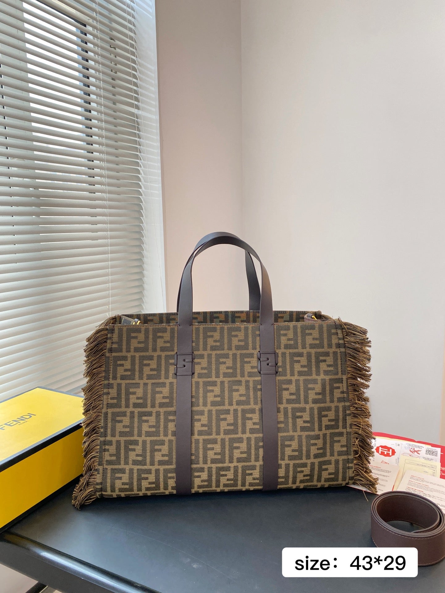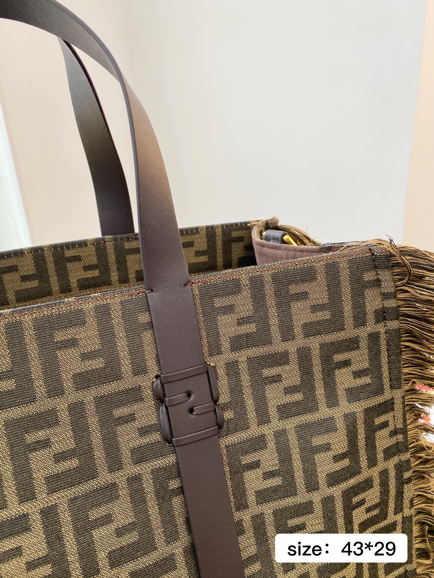 Fendi FF Jacquard Tassel Tote Bag with Removable Strap. This monogrammed tote satisfies my need for a relaxed feel. It's spacious and soft, creating a casual, relaxed look! It has a sculpted feel, and even when carried alone, it's incredibly stylish. The spacious interior is incredibly spacious, making it incredibly practical. It's both retro and stylish, and a great-looking bag!