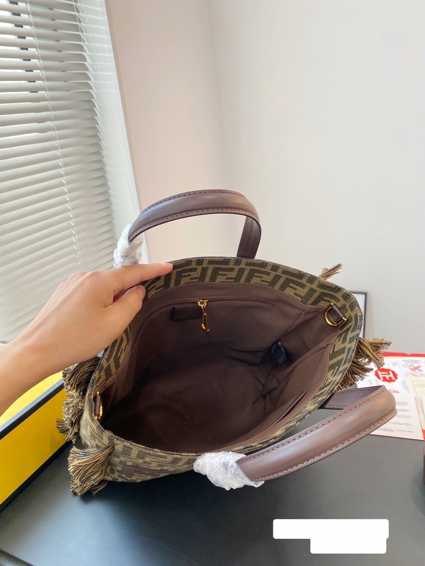Fendi FF jacquard tassel tote bag with detachable shoulder strap. This monogram tote satisfies my need for a relaxed look. It's spacious and soft, creating a casual and relaxed feel! It has a natural sculpted feel, and even when carried alone, it's incredibly stylish. The spacious interior is plenty roomy, making it a super practical, retro, and stylish bag