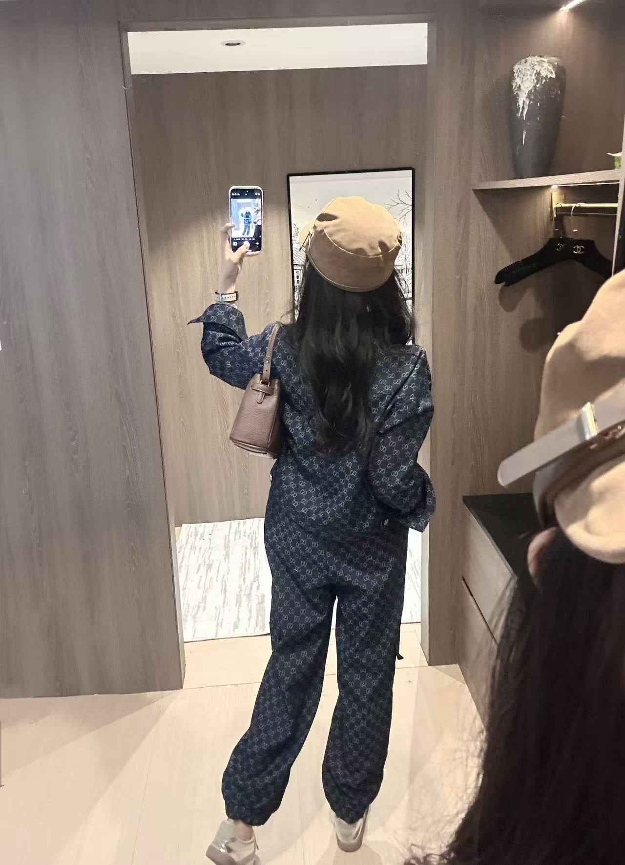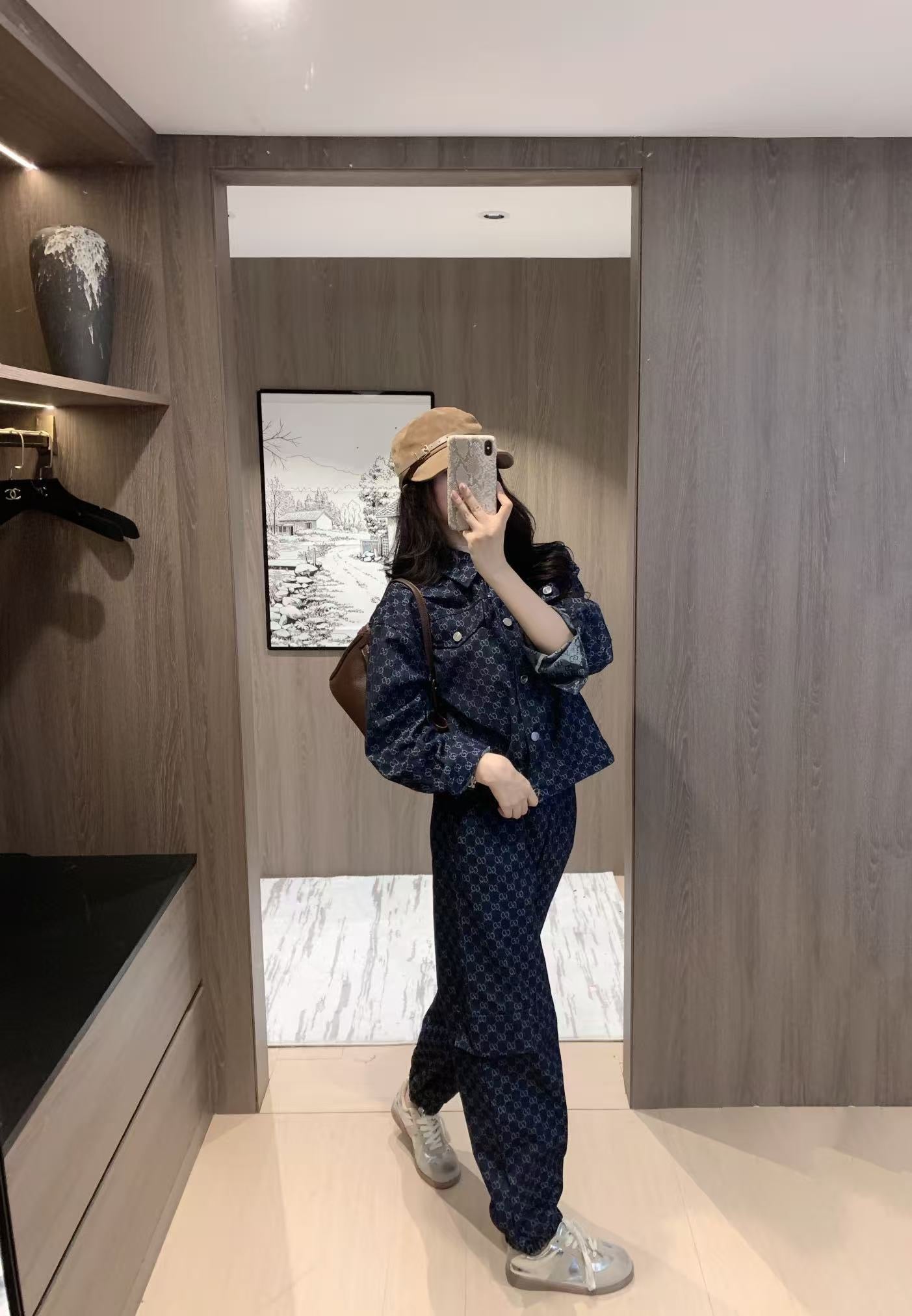 GUCCI* latest early fall all-over printed denim suit. High-quality texture. ✨ jacquard all-over print. Slimming and taller. Simple and elegant. Available in one set. Available in one color.