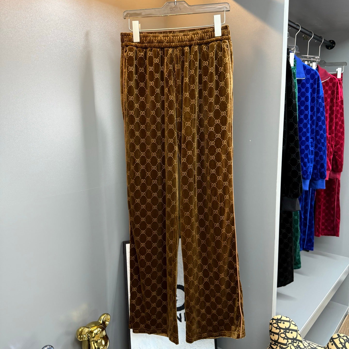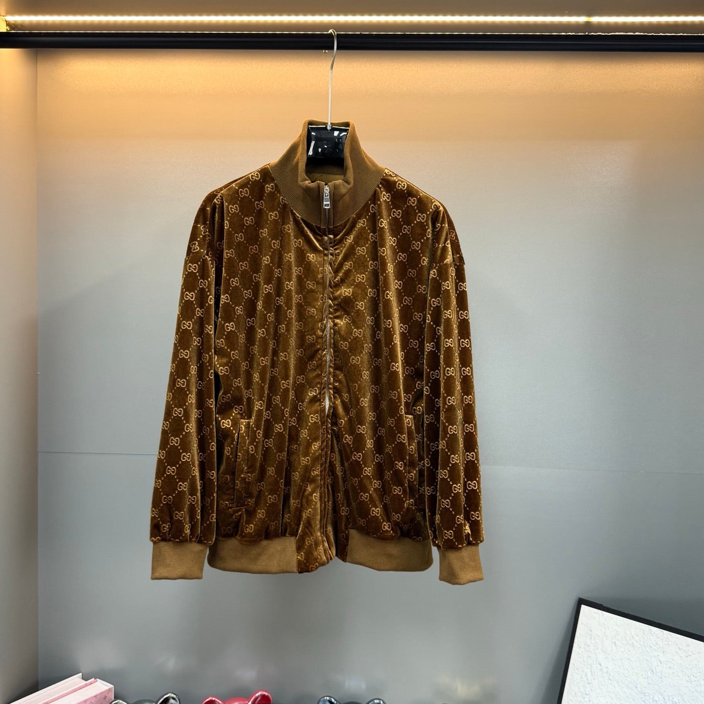 GUCCI's new velvet casual suit for fall and winter features a loose, stand-up collar and zippered design. This premium sportswear suit features an all-over jacquard logo print and a loose fit with an elastic waistband. Perfect for both men and women, this set comes with all three standard features and is a high-quality version.