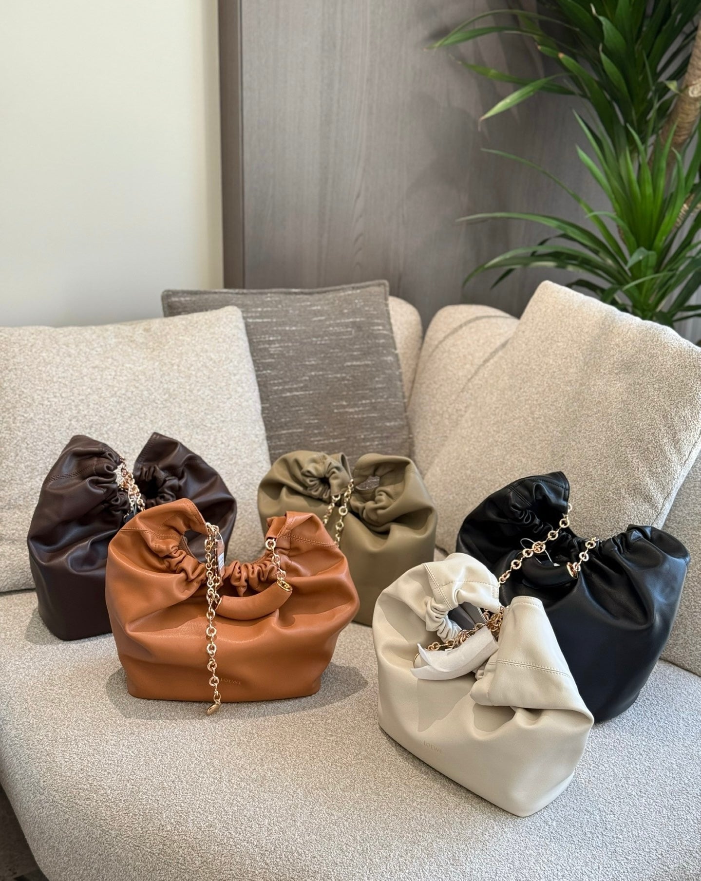 The Medium Nappa Sheepskin Squeeze Handbag is a new exquisite and feminine handbag. The newly released Squeeze handbag is made of soft and silky Mellow Nappa lambskin. The unlined structure effectively reduces the weight of the bag. It looks lighter. The ancient crescent-shaped bag opening is closed with an elegant ruffle, creating a relaxed and casual attitude. This bag also has - the highlight is the ergonomic Squeeze airbag handle, which is paired with an exquisite donut chain made of brass. The length can be adjusted by the chain link or an extension chain can be added to achieve different carrying methods such as hand, shoulder, and crossbody. The four airbag handles can be freely slid to improve comfort. The bottom of the chain is embellished with an Anagram