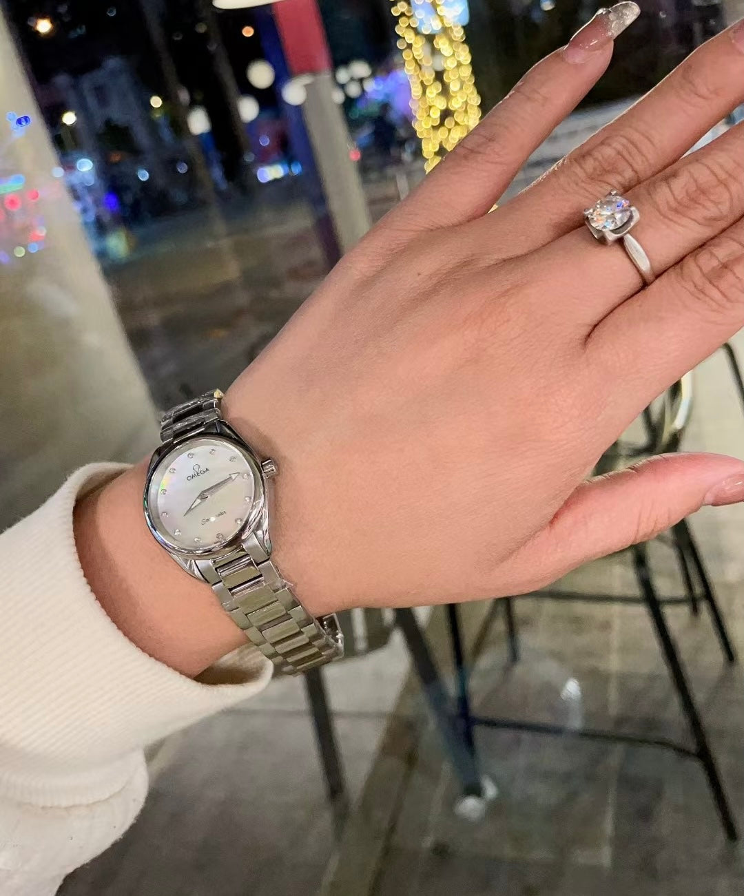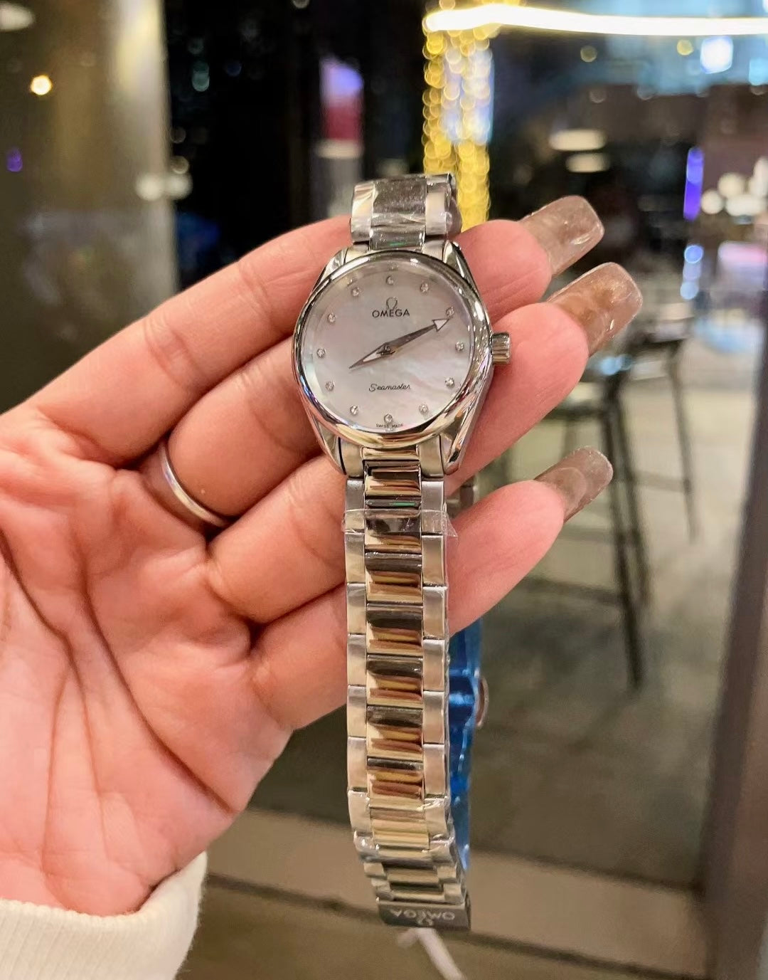 This stainless steel watch, with a symmetrical design and a 28mm diameter, is incredibly delicate and exquisite! It features a glossy ice-blue dial with eight rhodium-plated hour markers and four diamond hour markers set in rhodium-plated brackets. The hands are also rhodium-plated. The caseback features an embossed OMEGA Seahorse emblem against a wavy background.